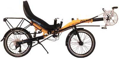 De DOLPHIN is door zijn twee 20" wielen een zeer compacte, snelle en wendbare fiets. Een strak sturende fiets die uitnodigt tot sportief rijden. Standaard is hij voorzien van hydraulisch gedempte instelbare vering zodat men zelf het comfort bepaald. Door zijn afmetingen is deze fiets uitermate geschikt voor kleinere mensen. Stalling problemen zijn verleden tijd door zijn zeer praktische en degelijk standaard. De stoel is ruim verstelbaar waariedereen een prettige zit vinden.