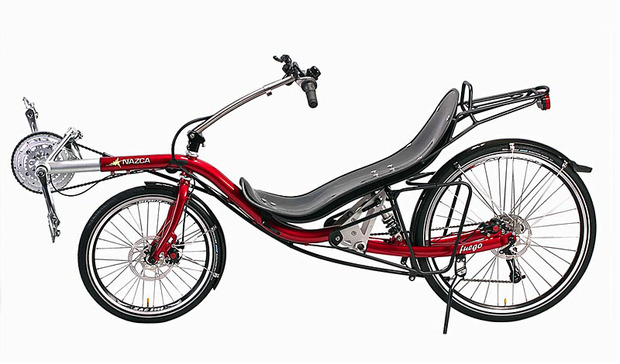 Sinds twee weken ben ik in het bezit van een Nazca Fuego All-round in de kleur oranje. Ik zocht al een tijdje naar een dergelijke ligfiets, laag, maar wel geveerd om mijn woon-werkverkeer (12km) mee te rijden. Op marktplaats zag ik deze Fuego staan en ben meteen gaan kijken. Daar aangekomen bleek de fiets in zeer goede staat te verkeren, enkel de voorderailleur was kapot (bekend probleem met de Tiagra voorderailleur is dat een nokje dat het veertje tegenhoudt van kunststof is en makkelijk afbreekt). Inmiddels zit er een nieuwe voorderailleur op, een B&M Ixon IQ koplamp en een Sigma 1909 kilometerteller.