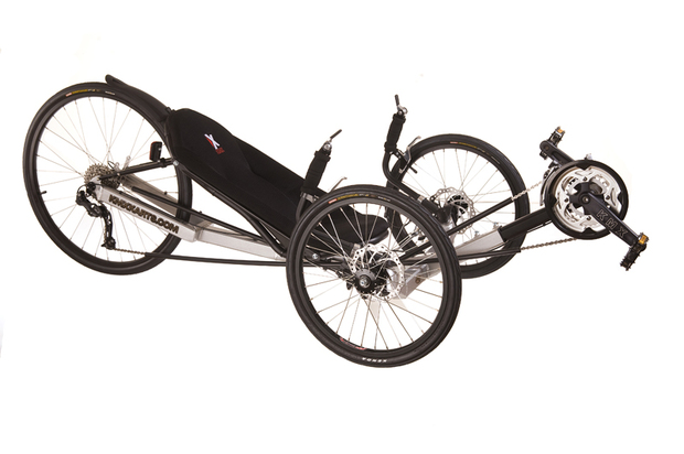De Venom heeft een stijf aluminium frame, 26" achterwiel, 20" voorwielen, Shimano SLX 27-speed groep en schijfremmen op de voorwielen.