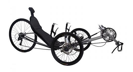 Snelle sportieve trike in CrMo staal, met 28" 700C (622) achterwiel en twee 20" (406) voorwielen.