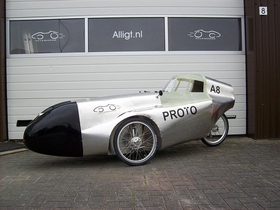 Dit is een snelle velomobiel die alleen verkrijgbaar is als aluminium bouwpakket.