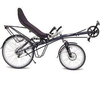 Volgeveerde ligfiets. Gevanceerde achtervering. Voor 20", achter 26". Onderstuur.